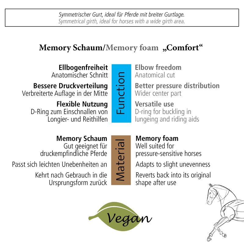Der Kurzgurt Memory Foam "Comfort" ohne Elast ist im Brustbereich extra breit geschnitten, um die Druckverteilung für das Pferd zu optimieren. Dabei bleibt der Gurt formstabil und verzieht sich trotz des weichen und angenehmen Materials beim Reiten nicht.
